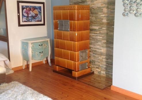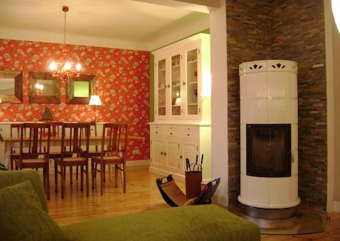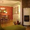 Für romantische Atmosphäre vergangener Zeiten sorgen im EG ein moderner Kaminofen und im Balkonzimmer ein historischer Kachelofen .