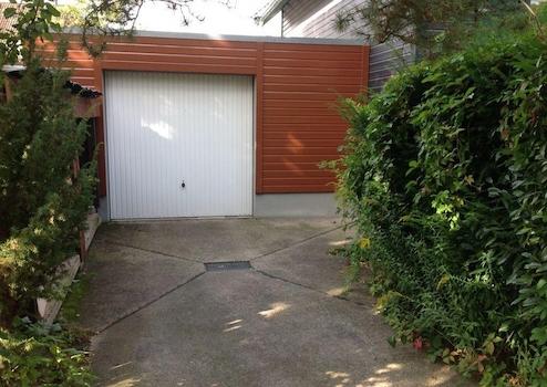 Die angrenzende 52 qm große Garage (BJ 2012) mit hohen Decken ( 2,75 m bis 3,00 m ) und einem 2,50 x 2,50 m großen Schwingtor ist ebenerdig über eine separate Einfahrt zu erreichen.