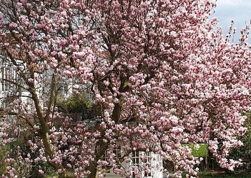 Der im EG liegende Wohn- und Esszimmerbereich ist mit Kamin und Fischgrät-Parkett aus Vollholz ausgestattet und blickt in den von Nachbargärten umschlossenen Süd-West Garten. Man erreicht den Garten über eine große Terrasse, die durch Schiebetüren, die sich komplett öffnen lassen, im Sommer wie ein Wohnzimmer im Garten genutzt werden kann. Wenn es kühler wird, kann man in einem hübschen, kleinen Pavillon gemütlich sitzen.