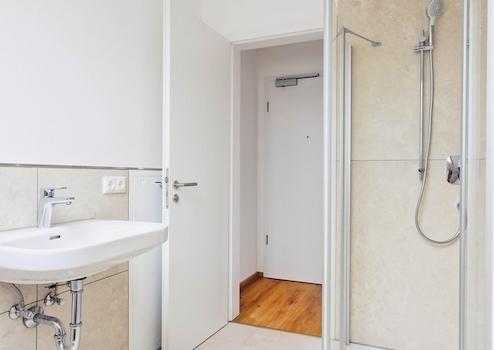 Das Badezimmer ist mit einem Fenster, einer modernen Dusche sowie einem Waschmaschinenanschluss ausgestattet. Zwei weitere Zimmer eignen sich ideal als Schlafzimmer, Homeoffice oder Gästezimmer.
