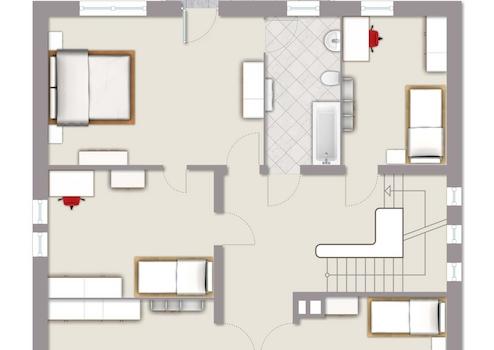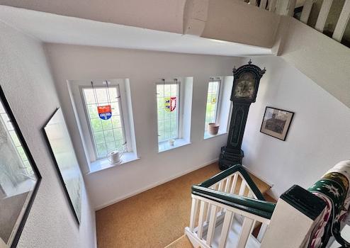 Obergeschoss: Flur, Schlafzimmer, vier weitere Zimmer, Tageslichtbad mit Badewanne, zwei Balkone