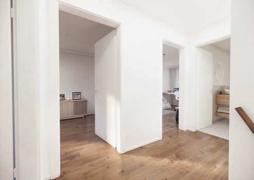 Im Erdgeschoss befindet sich ein großzügiger Eingangsbereich mit ausreichend Platz für Garderobe und Stauraum. Ein Gäste-WC ergänzt diese Ebene. Besonders praktisch ist der direkte Zugang von der Garage in das Haus – ideal bei jedem Wetter.