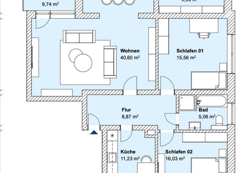 Herzstück der Wohnung ist das großzügige Wohnzimmer mit Essbereich (ca. 40,60 m²). Durch die großen Fensterflächen wirkt der Raum besonders hell und offen. Von hier aus gelangen Sie direkt auf die schöne Terrasse mit ca. 9,74 m², die sich ideal zum Entspannen oder für gemütliche Abende im Freien eignet.