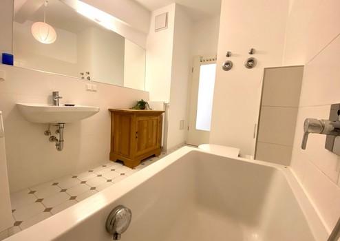 Insgesamt verfügt die Wohnung über 3 Zimmer, davon 2 Schlafzimmer sowie das große offene Wohnzimmer mit der Küche, ein Badezimmer mit Badewanne und ein Gästebad mit Dusche. Die Wohnung wird möbliert und auf Zeit vermietet.