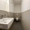 Das Badezimmer ist stilvoll gestaltet und verfügt über eine Badewanne, eine Dusche, ein Hänge-WC sowie einen praktischen Handtuchheizungshalter. Die Wände sind hier bis zur halben Höhe gefliest, was dem Raum eine moderne und zugleich pflegeleichte Optik verleiht. Auch das Gäste-WC ist halbhoch gefliest und fügt sich harmonisch in das Gesamtbild des Hauses ein.