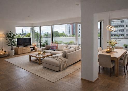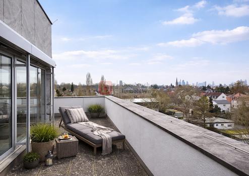 Skylineblick bei Tag. Lichtermeer bei Nacht. Und eine große Süd-West Dachterrasse, wie man sie in Frankfurt nur selten findet.