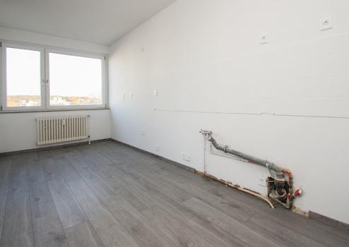 Die helle Wohnung liegt auf der neunten Etage eines gepflegten Mehrfamilienhauses – natürlich mit Aufzug. Hier genießen Sie die Aussicht über den grünen Stadtweiher bis hin zum Hildener Wald.