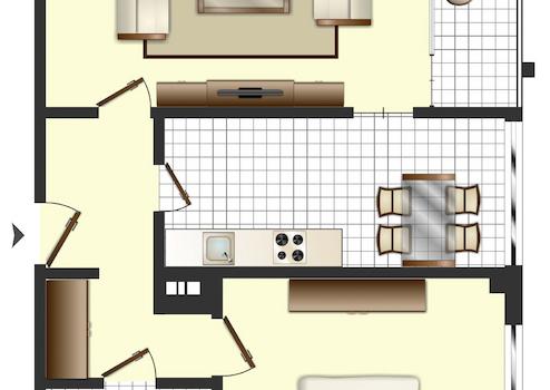 Zwei Wohn- und Schlafräume verteilen sich auf ca. 61 m². Mittelpunkt ist der großzügig und offen gestaltete Wohnbereich mit direktem Zugang zur Küche und dem Essbereich.