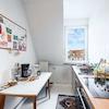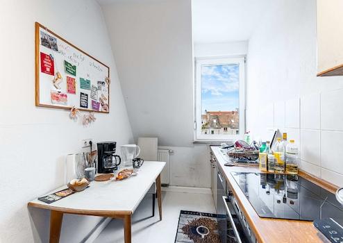 Große Fensterflächen sorgen in den Wohnräumen für viel Tageslicht und einen freien Blick über die umliegenden Dächer – das schafft Weite und unterstreicht das luftige Wohngefühl. Die Küche ist als eigener Raum gestaltet und bietet neben Arbeitsfläche und Stauraum auch Platz für einen kleinen Essbereich am Fenster – ideal für den schnellen Kaffee am Morgen oder das Abendessen zu zweit.