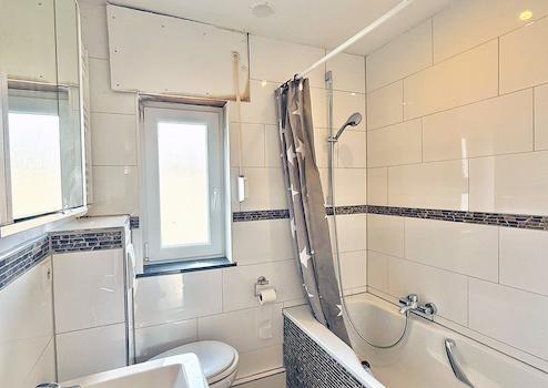 Im Obergeschoss stehen zwei Schlafzimmer sowie ein Tageslichtbad mit Wanne, WC und Waschbecken zur Verfügung. Die Warmwasseraufbereitung erfolgt über einen Durchlauferhitzer. Der geräumige Flur eignet sich ideal als zusätzliche Stellfläche oder als Arbeitsbereich.
