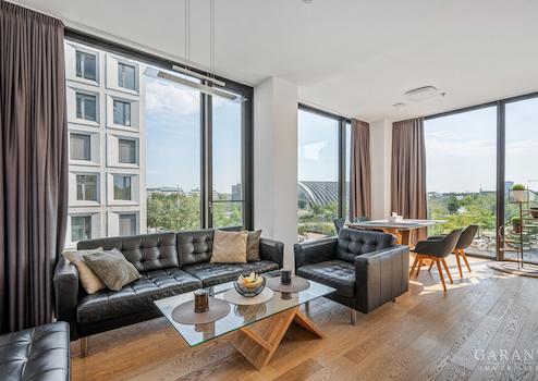 Raumhohe Panoramafenster mit dreifachisolier- und Schallschutzverglasung, eine beeindruckende Deckenhöhe von 2,80 m sowie eine intelligente Beschattungsanlage schaffen eine helle, angenehme Wohnatmosphäre mit Blick auf die Münchner Skyline und den Hirschgarten. Die Lage im 3. Obergeschoss sorgt für optimale Lichtverhältnisse zu jeder Tageszeit.