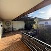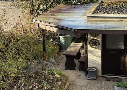 Der Außenbereich mit zwei überdachten Terrassen und verschiedenen Pflanzen lädt zum Verweilen, Entspannen und Genießen ein.