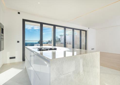 Die maßgefertigte Küche mit Markengeräten, Quarzit-Arbeitsfläche und integriertem Spritzschutz fügt sich harmonisch in das elegante Gesamtbild ein. Heiz- und Kühldecken sorgen ganzjährig für ein angenehmes Raumklima, ergänzt durch elektrische Beschattung, kontrollierte Wohnraumbelüftung und ein BUS-System zur zentralen Steuerung von Licht, Temperatur und Technik.