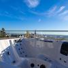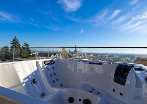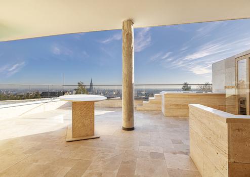 Die Dachterrasse ist ein echtes Highlight. Eine stilvoll mit Naturstein verkleidete Sitzecke, eine Außensauna sowie ein Whirlpool mit integrierten Sonnenliegen im Wasser schaffen eine private Wellness-Oase in luftiger Höhe – ein Rückzugsort mit maximaler Privatsphäre und hohem Erholungswert.