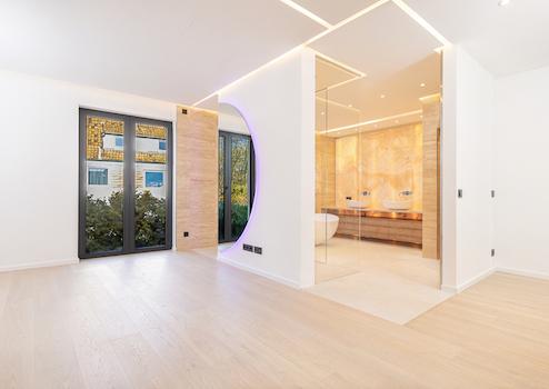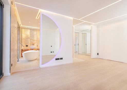 Der private Bereich ist klar vom offenen Lebensraum getrennt. Das Hauptschlafzimmer verfügt über einen offenen Schlafbereich mit direktem Zugang zum luxuriösen Masterbad. Dort erwarten Sie eine freistehende Badewanne, eine großzügige Dusche, hinterleuchtete Onyxplatten und hochwertige Armaturen. Ein separates Gäste-Bad sowie ein praktischer Abstellraum ergänzen das Raumkonzept. Weitere Zimmer eignen sich ideal als Kinder-, Gäste- oder Arbeitszimmer.