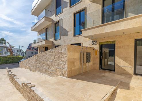 Das Gebäude überzeugt durch seine edle Travertin-Natursteinfassade, den barrierefreien Zugang, ein stilvolles Treppenhaus mit Lichtkonzept sowie einen Aufzug bis in die Tiefgarage. Für Energieeffizienz sorgen eine Wärmepumpe und eine unterstützende Photovoltaikanlage; optional kann Gas zugeschaltet werden. Zur Sicherheitsausstattung gehören Videoüberwachung und eine Videosprechanlage.