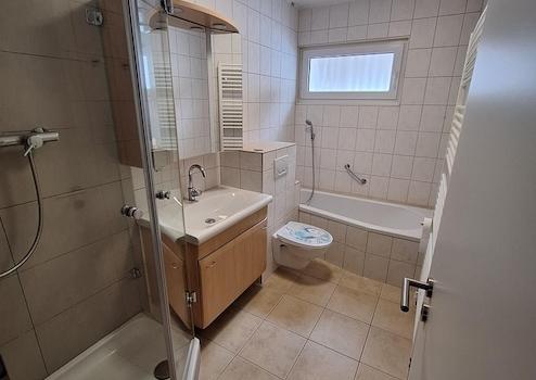 Das Tageslichtbad verfügt sowohl über eine Badewanne als auch eine Dusche. Zusätzlich steht ein separates Gäste-WC zur Verfügung.