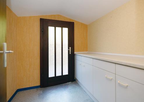 Im Anbau des Erdgeschosses liegen die separate Küche mit Zugang zu einem praktischen Abstellraum und dem Garten sowie ein Tageslichtbad mit Dusche. Die überdachte Terrasse erweitert den Wohnbereich ins Freie und lädt zu gemütlichen Stunden im Garten ein.