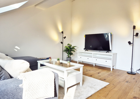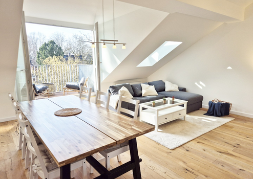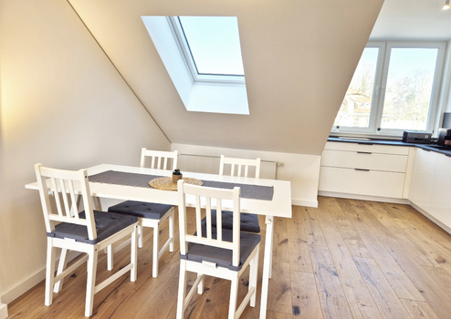 Das großzügige Wohnzimmer (ca. 23,5 m²) mit offener angrenzender Küche bildet das Herzstück der Wohnung. Wie alle Wohnräume ist es mit modernem Echtholzparkett (Eiche) als Fußbodenbelag ausgestattet. Bereits hier erkennt man den besonderen Charme der Dachgeschosswohnung: Die gemütlichen Dachschrägen sind modern und dem natürlichen Aufbau des Daches sowie den tragenden Elementen nachempfunden. Im Wohnzimmer finden Esstisch, Couch und Fernseher sowie die vollständig mit hochwertigen Elektrogeräten ausgestattete Einbauküche ihren Platz.