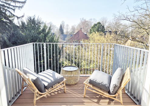 Die helle Ausleuchtung ergibt sich neben den beiden Dachfenstern auch durch die große Gaube im Wohnzimmer, von welcher man auf den Balkon gelangt. Der nach Südwesten ausgerichtete Balkon liegt rückseitig und somit ruhig zum Garten. Mit einer Fläche von knapp 4 m² bietet er Platz für einen kleinen Tisch und Stühle – der Blick kann hier ins Grüne schweifen.
