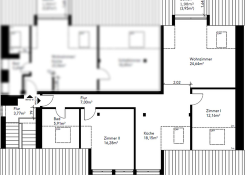 Insgesamt wirkt die Wohnung durch die nicht anrechenbaren Teile der Dachschrägen größer, als es die Quadratmeterangabe vermuten lässt.