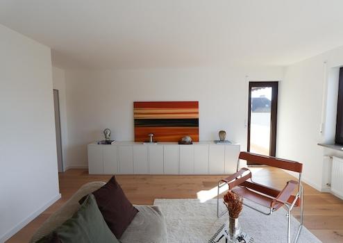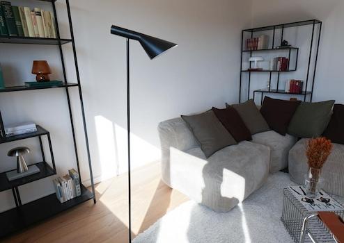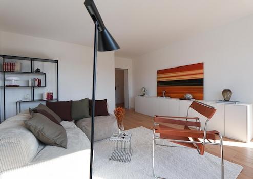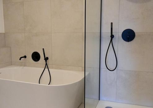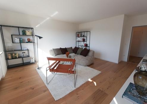 Die Materialien sind bewusst gewählt: Eichenparkett in den Wohnräumen, großformatige italienische Fliesen (60 × 60 cm) in Dusche und WC. Das Badezimmer wurde vollständig neu gestaltet und mit Markenprodukten von Geberit und Duravit hochwertig ausgestattet. Highlight ist die halb freistehende Badewanne. Helle Fliesen in Betonoptik, kombiniert mit schwarzen Armaturen, geben dem Bad einen aufgeräumten, modernen und zeitlosen Charakter. Ein separates Gäste-WC ergänzt das Raumangebot, ein Anschluss für einen Waschtrockner ist vorgesehen.