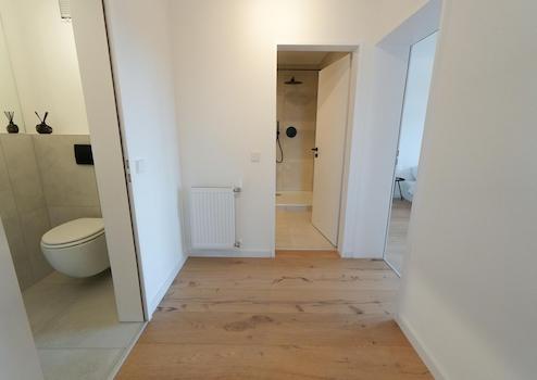 • Separates WC: Gehoben ausgestattet in modernem Stil mit wandhängendem WC und großem Spiegel für ein angenehmes Raumgefühl