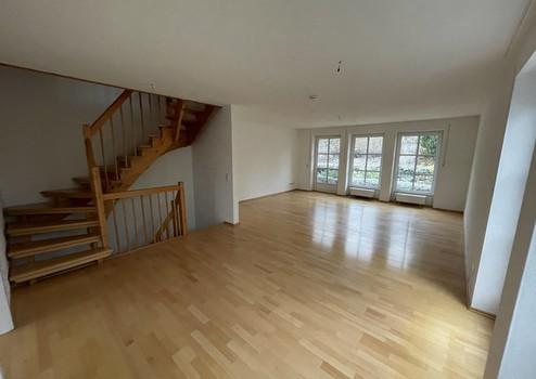 EG: Wohnzimmer (36 m²) mit Schiebetür zur Südterrasse, Einbauküche, Gäste-WC, überdachter Freisitz