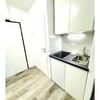 Offene, helle Einbauküche mit Kochfeld, Kühlschrank und sonstige Ausstattung