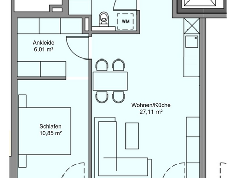 Herzstück der Wohnung ist der offen gestaltete Wohn- und Essbereich mit integrierter Küche und direktem Zugang zur großzügigen Südterrasse. Das Schlafzimmer verfügt über einen separaten Ankleidebereich – ein seltenes Ausstattungsmerkmal in dieser Wohnungsgröße. Terrasse und Garten erweitern den Wohnraum nach außen und sind sowohl vom Wohn- als auch vom Schlafbereich zugänglich.