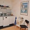 gemütlichen Wohnraum mit einem hochwertigen Schlafsofa, zum bequemen Sitzen oder Schlafen. Die Küche ist etwas separat in einer Ecke untergebracht. Im hinteren Teil befindet sich ein toller Arbeitsplatz mit Blick in den Garten. Durch eine Tür gelangt man zur eigenen Terrasse, in der man sich sehr gut entspannen kann. Die Wohnung ist perfekt für 1 Person