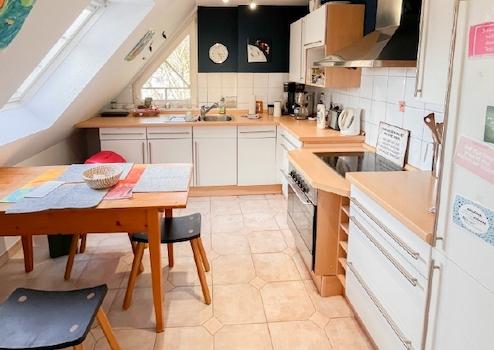 Kühlschrank, Gefrierfach, Dunstabzugshaube, Kaffeemaschine, Wasserkocher, Töpfe, Pfannen, Teller, Besteck, Gläser und alles für den täglichen Bedarf. Esstisch mt 4 Sitzhockern.