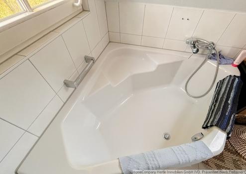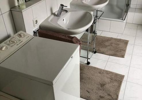 Dusche, Wanne, 2 Waschbecken, WC, Waschmaschine und Trockner (Kombigerät von Siemens)