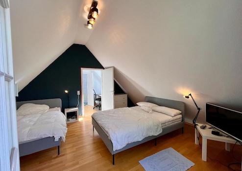 2 separate Betten (140x200), 2 Sideboards, 2 kleine Nachttische mit kleiner Lampe, TV