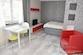 Wohn-/Schlafzimmer mit Bett 1,20x2 m, roter Ledersessel, Tisch mit 2 Stühlen, Flachbild-TV.
