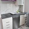 Kochnische mit 2-Platten-Herd, Kühlschrank, Spüle, Geschirrschrank.