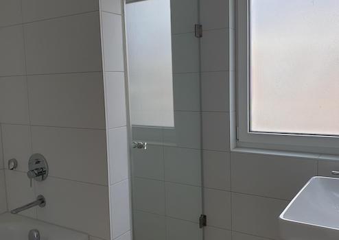 Badewanne, bodenbündige Dusche mit Glaspendeltüre