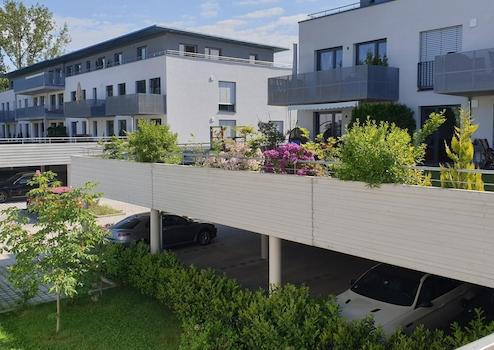Zur Wohnung gehören 1 Stellplatz im überdachten Parkdeck (55€/Monat) und ein Stellplatz im Außenbereich (33€/Monat).