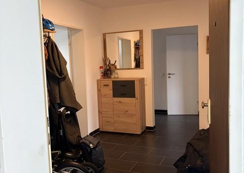Bereits beim Betreten der Wohnung fällt der vergleichsweise großzügige Eingangsbereich auf, der neben einer Garderobe auch zusätzliche Stellfläche bietet. Diese eignet sich beispielsweise gut zum Abstellen von Kinderwagen oder Ähnlichem.
