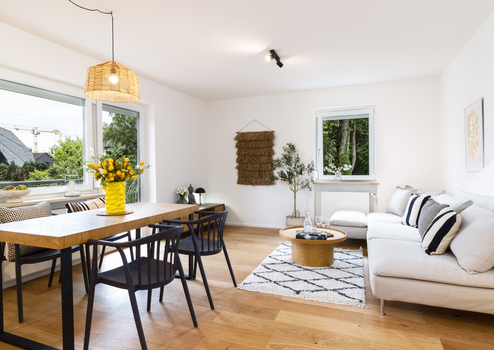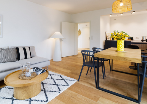 Herzstück der Wohnung ist der großzügige, lichtdurchflutete Wohnbereich mit beeindruckender Fensterfront, die für eine helle und freundliche Atmosphäre sorgt. Von hier aus gelangen Sie direkt auf den nach Westen ausgerichteten Balkon – der ideale Ort, um die Nachmittags- und Abendsonne zu genießen. Ein neu verlegter Parkettboden verleiht dem Raum zusätzliche Wärme und rundet das hochwertige Gesamtbild ab.