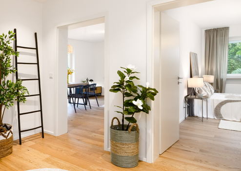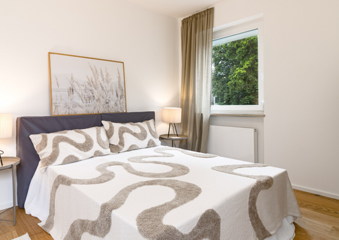 Auch das Schlafzimmer ist nach Westen ausgerichtet. Beide Räume öffnen sich zum Balkon hin und sind angenehm ruhig gelegen – beste Voraussetzungen für eine entspannte Wohnatmosphäre und erholsame Nächte.
