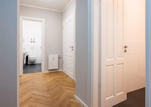 Hochwertige Bodenbeläge (Parkett in den Nutzräumen, Fliesen in Sanitär- und Funktionsbereichen)