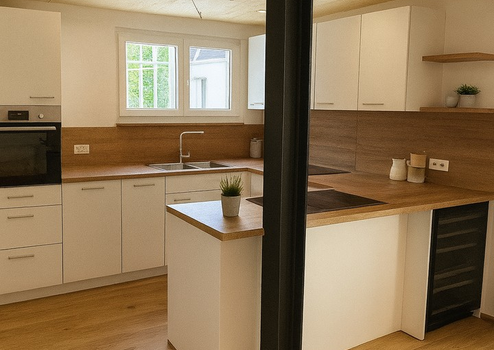 - Küche: Maßgefertigte Einbauküche mit Kochinsel, Weinkühlschrank und Bosch-Geräten (zzgl. 110 €/Monat)