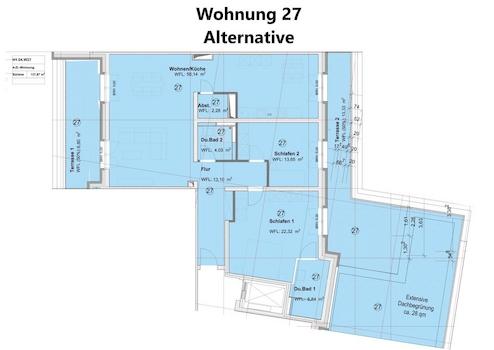 Das Angebot bezieht sich auf die Wohnung 27 im Penthousegeschoß = Staffelgeschoß im Baufeld 2 b. Von der zentralen Diele mit Garderobe gelangen Sie in den hellen Wohn/Eßbereich mit angeschlossener Küche von insgesamt ca. 57 m² mit Ausgang auf die schöne Dachterrasse 1 nach Süden von ca. 14 m² sowie die Dachterrasse 2 von ca. 26 m² mit anschließendem Dachgarten von ca. 28 m². Dem Kochbereich ist ein praktikabler Abstellraum zugeordnet. Von der zentralen Diele mit Garderobe sind das Gäste-Duschbad, das schöne Kinderzimmer/Büro von ca. 14 m² mit Ausgang auf die Dachterrasse 2 sowie der Elternprivatbereich bestehend aus dem Schlafraum Schlafraum von 23 m² mit Ausgang auf die Dachterrasse 2 mit direkt zugeordnetem Tageslichtbad.