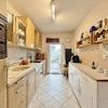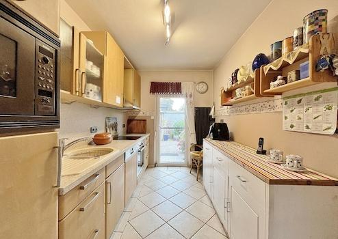 Die voll ausgestattete Küche verfügt über einen praktischen Außenzugang sowie Platz für einen angrenzenden Essbereich. Von hier aus gelangen Sie direkt auf die Terrasse, die sowohl sonnige als auch schattige Bereiche bietet – ideal für gemütliche Stunden im Freien.