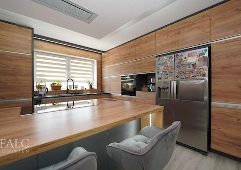 Schon beim Betreten fällt der Blick auf die moderne Küche, die wahrlich den Titel „Gourmet-Tempel“ verdient. Ob Sie Anfänger, Hobbykoch oder passionierter Küchenprofi sind – diese Küche erfüllt alle Wünsche! In L-Form angeordnet, mit einer großen Kochinsel und Sitzgelegenheiten, sowie LED-Beleuchtung in Holzoptik, ist sie der perfekte Mittelpunkt für jede Familienfeier. Hochwertige Einbaugeräte, darunter eine doppeltürige Kühl-Gefrierkombination und ein Bosch-Backofen in Brusthöhe, machen das Kochen zu einem Vergnügen.