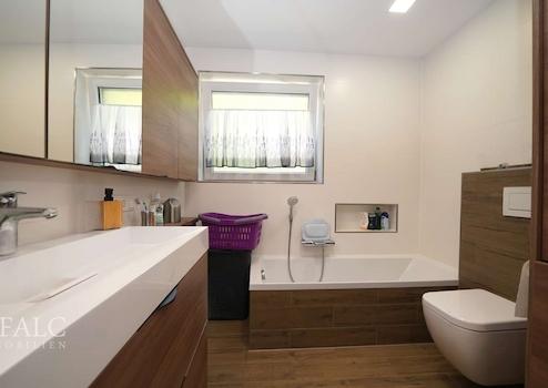 Vom Wohnzimmer aus gelangen Sie in Ihre private Spa-Oase. Auf rund 9 m² erwartet Sie ein luxuriöses Badezimmer mit einer eleganten Eckdusche mit Glastür und einer Badewanne, die zum Entspannen einlädt. Große Fenster lassen viel Tageslicht herein und sorgen dafür, dass der Wasserdampf nach einer heißen Dusche problemlos abziehen kann. Praktische Badezimmermöbel in Holzoptik bieten ausreichend Stauraum für all Ihre Utensilien, und eine Handtuchheizung sorgt für angenehm vorgewärmte Handtücher.