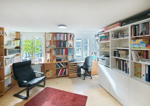 Über die Treppe erreichen Sie das Obergeschoss. Hier befinden sich ein Schlafzimmer, ein großzügiges Badezimmer mit Badewanne sowie ein davorliegendes Durchgangszimmer, das sich ideal als Arbeits- oder Ankleidezimmer eignet.