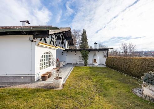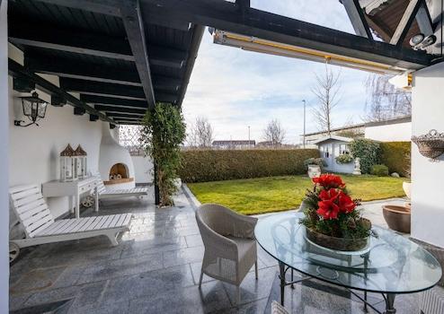 Die teilüberdachte Terrasse mit Außenkamin öffnet sich zum liebevoll angelegten Garten – eine private Oase auf ca. 393 m² Grundstück. Hier genießen Sie geschützte Ruhe, stilvolle Abende im Freien und einen Ort, der Innen- und Außenraum harmonisch verbindet.