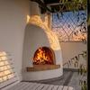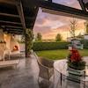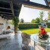Außenkamin sowie liebevoll gestaltete, teils überdachte Sitzbereiche im Garten